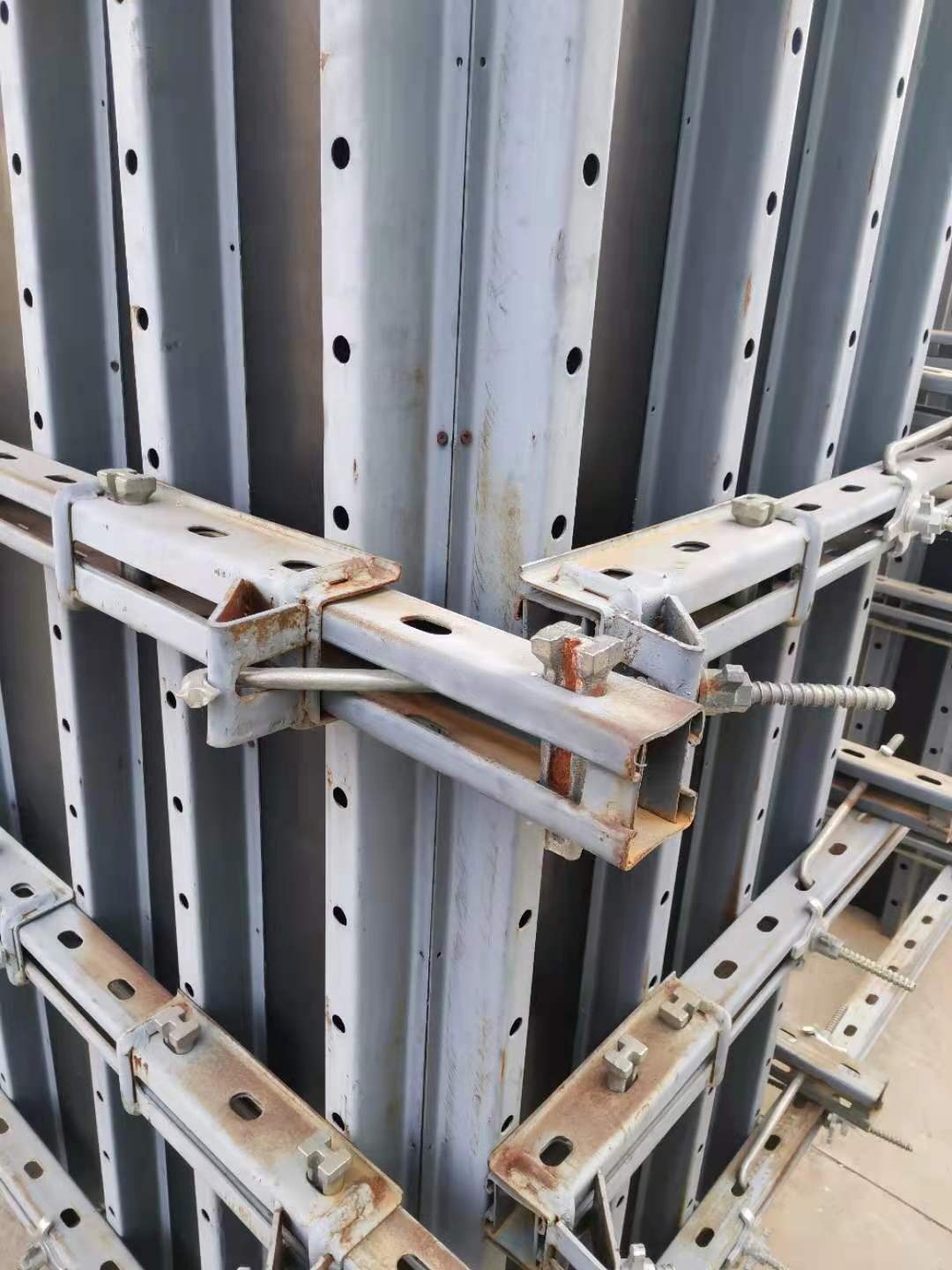 新型模板支撐體系主要構成件是橫梁、豎梁、穿墻螺絲、過口卡、300*300角、橫梁插銷、陽角鎖具等構成。